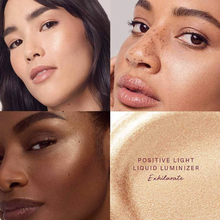 Positive Light Liquid Luminizer Mini en bestseller Exhilarate (melocotón dorado con perlas rosas) se difumina uniformemente para conseguir un toque de luz de larga duración que no se difumina ni se arruga.